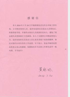 而后管理处收到业主黄彩玲的感谢信。这本是我们分内工作,但是收到业主感谢信我们还是非常激动,因为这是业主对我们工作作风的鼓励和肯定。